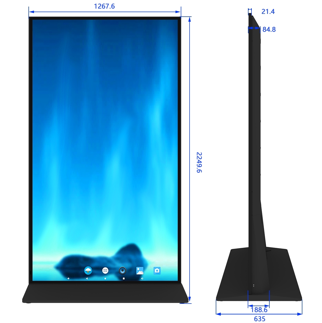 98寸大尺寸立式全面屏数字标牌广告机结 构 尺 寸(单位:mm)包 装 清 单产品型号98寸04Q-T08非触摸全屏98寸立式非触摸全屏1台 整机外形尺寸(长×宽×高)L1267.6xW635xH2249.6遥控器1个外箱包装尺寸(长×宽×高)L2360*W220*H1450电源线1条裸机净重(KG)113.3 整机毛重(KG)127.6 显 示 性 能 参 数显示尺寸(mm)1214.4x2158.4物理分辨率4K(3840x2160)整机峰值亮度≤350cd/㎡±20动态对比度5000:1观看视角H/V:178/178度屏幕比例16:9显示色彩10Bit,16.7M刷新率60HZ显示屏防护4mm全钢化高防爆玻璃背光类型DLED(直下式)背光灯寿命50000小时
